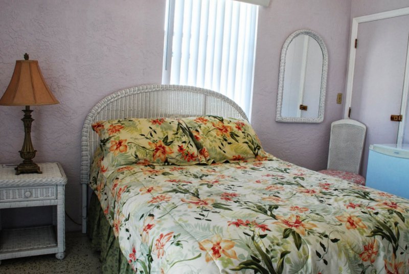 Our Guest Room is the coziest rental at Beau Lido Suites. This ground floor rental has a double bed, full bath with shower stall and TV.